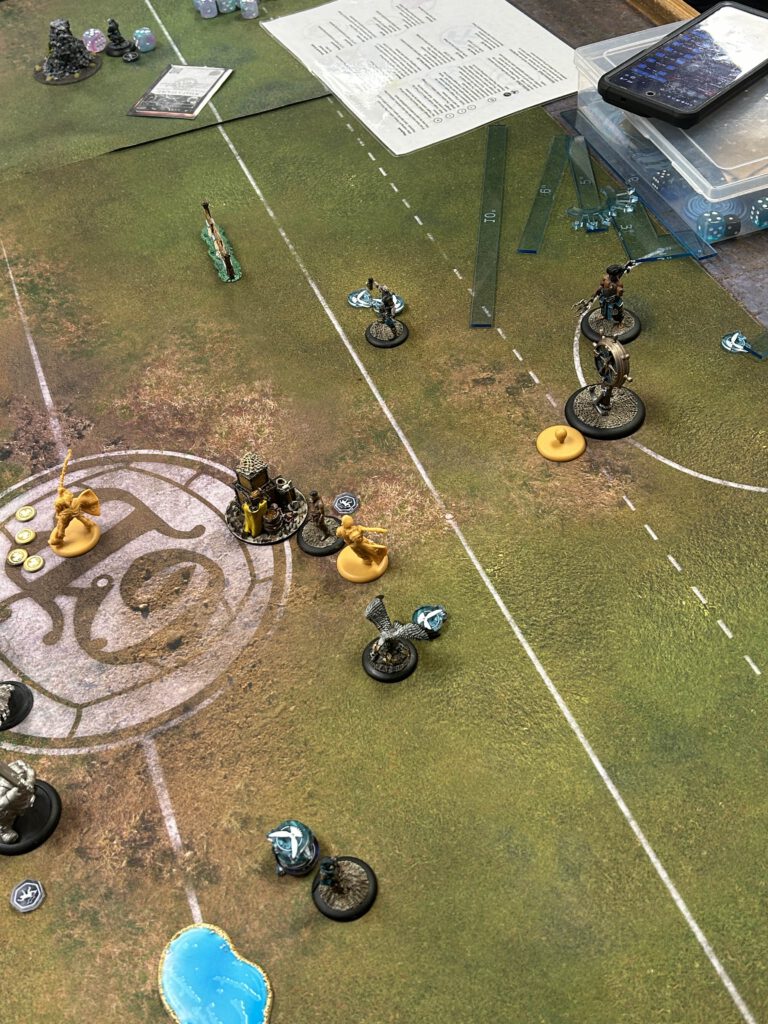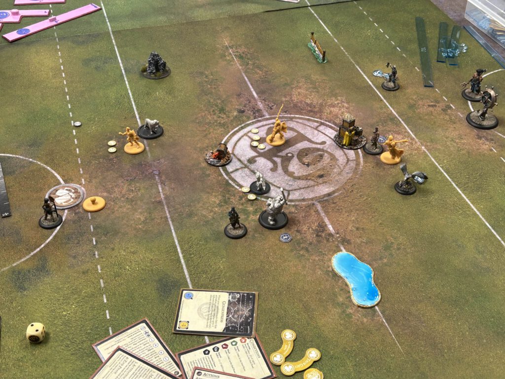 With the mid pitch presence of Tapper committed to the developing scrum Windfinder runs forward before charting a Perfect Course to get her injured crewmate away from the nascent Barroom Brawl that Tapper has started and Fathom up in range of a potential goal run. The brazen buccaneer follows up by rushing Mash then saying “Eye Spy a Brewer on his back” and getting the crowd and Momentum solidly behind her team as she dodges away. Hooper, not about to let a Marked Target get away, Heroically charges forward and Shoves The Boot In as he absolutely savages the prone Azimuth.